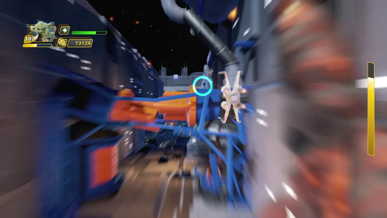 During the "The Battle of Yavin" mission in the dodge section before Darth Vader's TIE Fighter evade section. It's behind an orange and blue structure, go over the top of it.