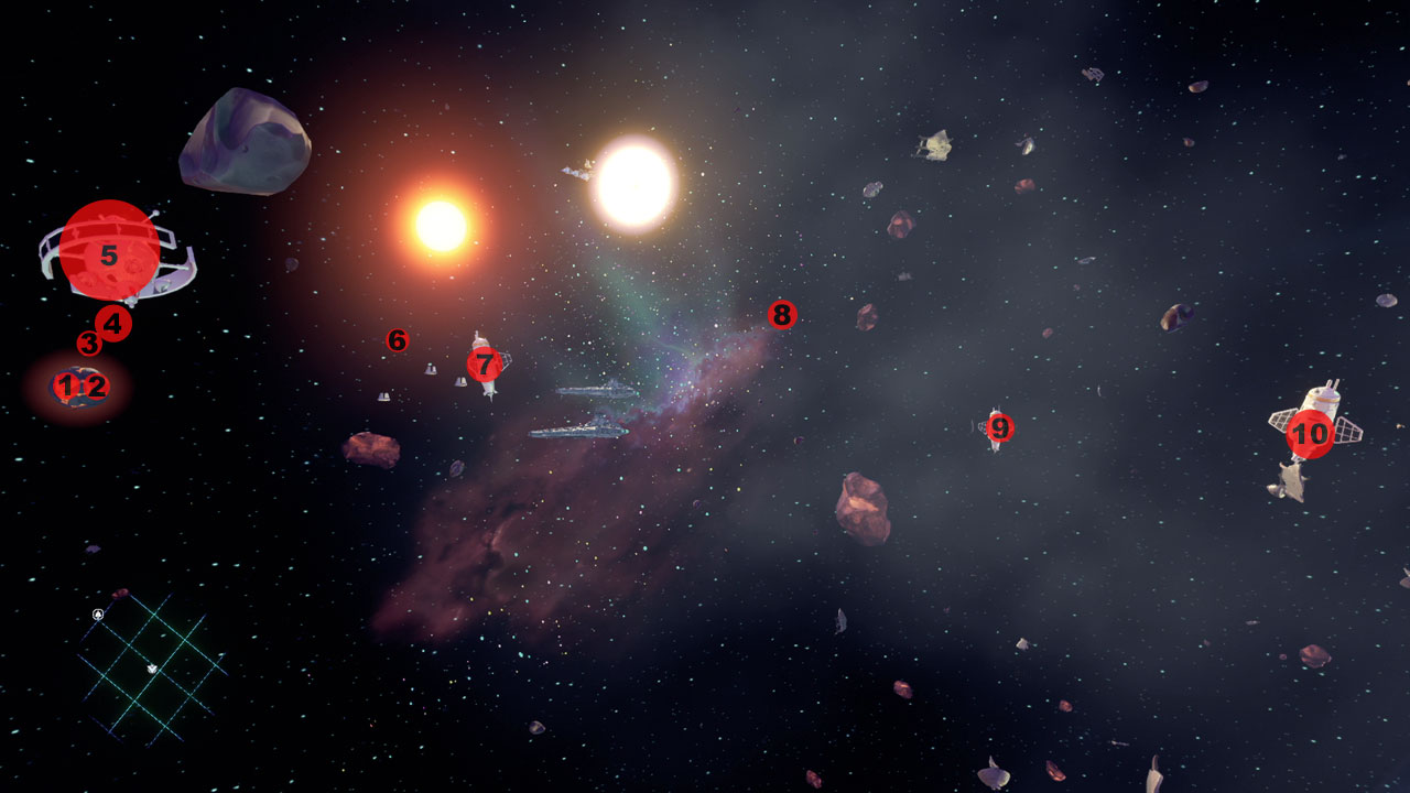 There are ten of them flying around in space. All hanging around by asteroids... and there are a lot of asteroids. So rather than have ten identical looking screenshots of Mynocks flying next to giant asteroids here is a single one from afar with their general locations marked. The view is from the left (port) side of the Star Destroyer.